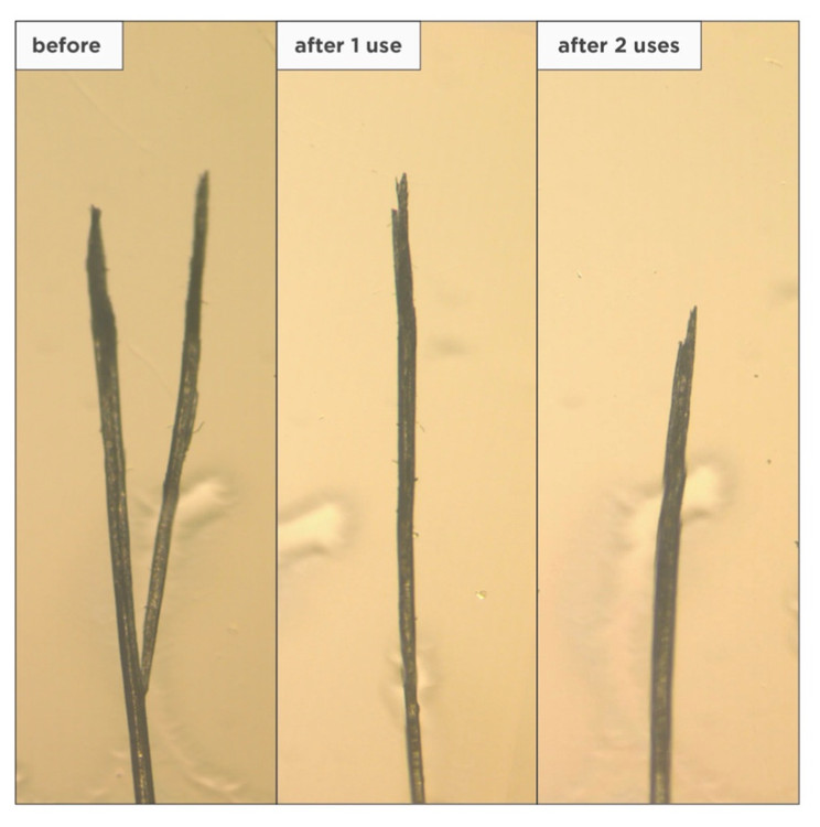 این تریتمنت که به لحاظ بالینی تست شده، پس از دو بار استفاده تا ۱۰۰٪ انتهای دو شاخهی موها را به وضوح میبندد.